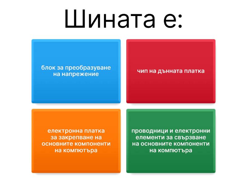 1) Шината е: a) блок за преобразуване на напрежение b) чип на дънната платка c) електронна платка за закрепване на основните компоненти на компютъра d) проводници и електронни елементи за свързване на основните компоненти на компютъра 2) Програмният код на стартираните програми се съхранява във: a) оперативната памет b) захранващия блок c) централния процесор d) дънната платка 3) Троянските коне са: a) заразяват изпълними файлове b) програми, които симулират работа, но тайно извършват други дейности c) копират системните файлове на друго място на харддиска d) нежелана информация, която се получава по пощата 4) Към характеристиките на централния процесор НЕ се отнася: a) разредността b) тактовата честота c) големината d) кеш паметта 5) Аритметично-логическото устройство е част от: a) оперативната памет b) шината c) централния процесор d) захранващия блок