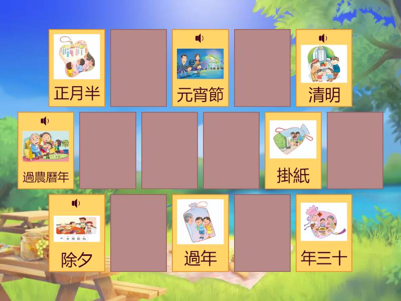 年三十 - 除夕, 過年 - 過農曆年, 正月半 - 元宵節, 掛紙 - 清明, 五月節 - 端午節, 七月半 - 中元節, 八月半 - 中秋節, 冬節 - 冬至,