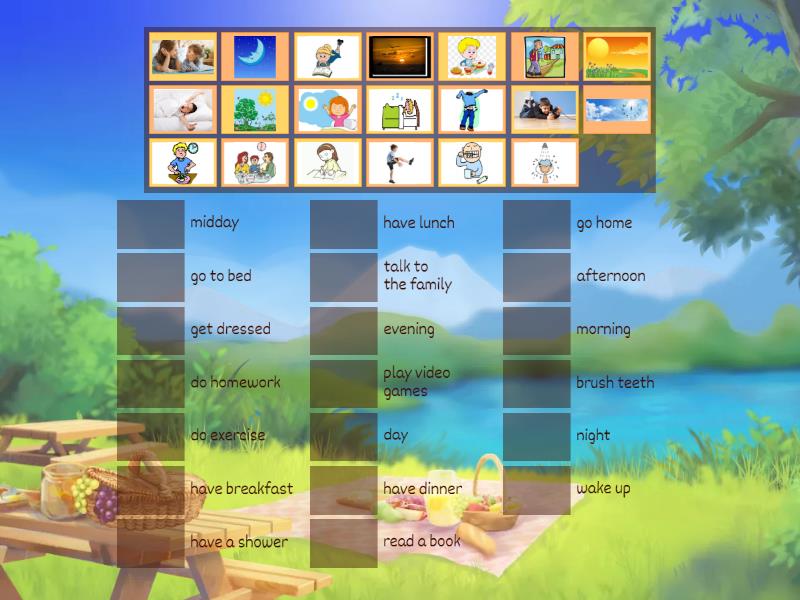 wake up, have breakfast, brush teeth, get dressed, have lunch, go home, do homework, read a book, have dinner, go to bed, have a shower, morning, midday, evening, afternoon, night, day, do exercise, play video games, talk to the family,