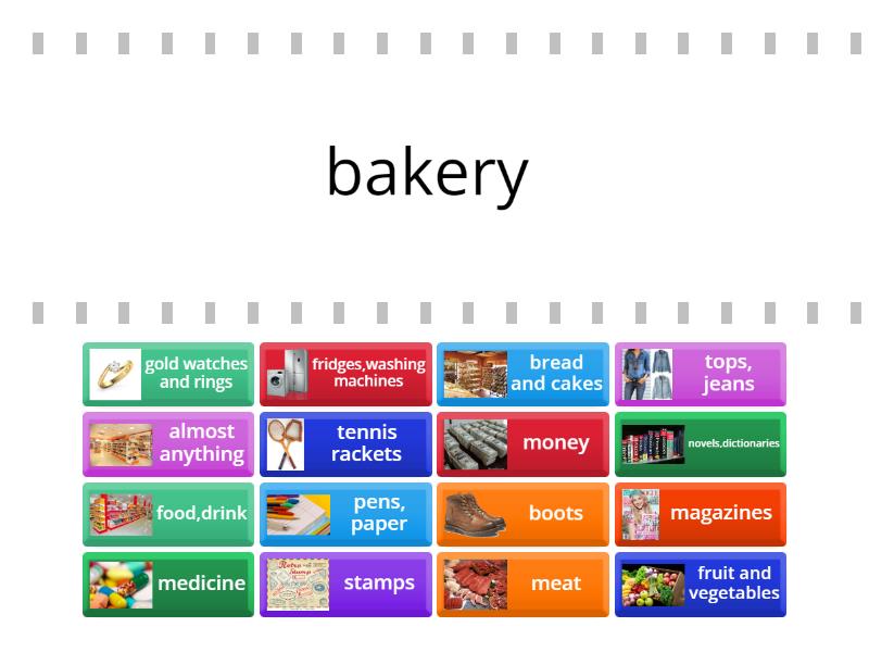 bread and cakes - bakery, money - bank, meat - butcher's, medicine - chemist's, almost anything - department store, fruit and vegetables - greengrocer's, gold watches and rings - jeweller's, magazines - newsagent's, stamps - post office, pens, paper - stationary shop, fridges,washing machines - electrical goods shop, boots - shoe shop, novels,dictionaries - bookshop, tops, jeans - clothes shop, tennis rackets - sports shop, food,drink - supermarket,