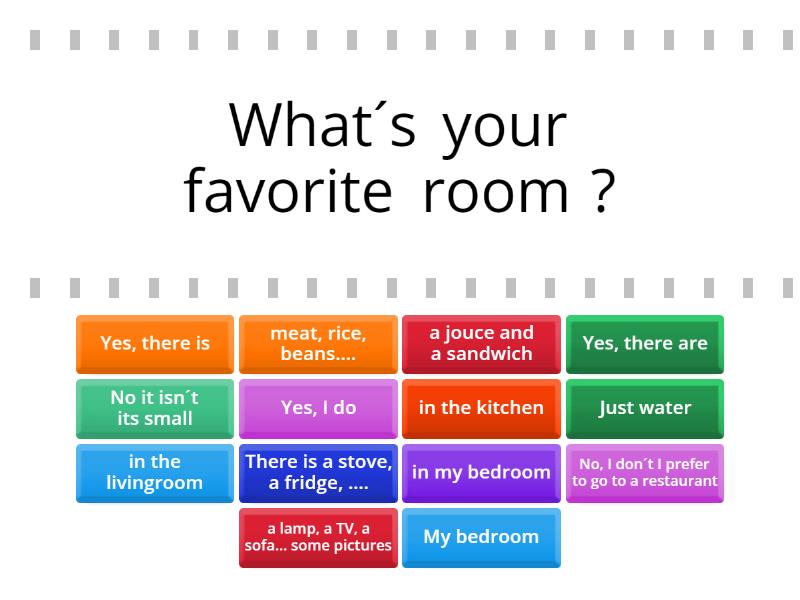 My bedroom - What´s your favorite room ?, a lamp, a TV, a sofa... some pictures - What´s in your livingroom?, Yes, there is - Is there a television in your bedroom?, Yes, there are - Are there books in the bed room?, Yes, I do - Do you have pictures in your room?, There is a stove, a fridge, .... - Descrive your kitchen , No it isn´t its small - Is the backyard big?, in the kitchen - Where do you cook?, in my bedroom - Where do you sleep?, in the livingroom - Where do you normally listen to music?, a jouce and a sandwich - What do you usually eat for breakfast?, meat, rice, beans.... - What do you usually have for lunch?, Just water - What do you usually drink with your lunch?, No, I don´t I prefer to go to a restaurant - Do you cook ?,