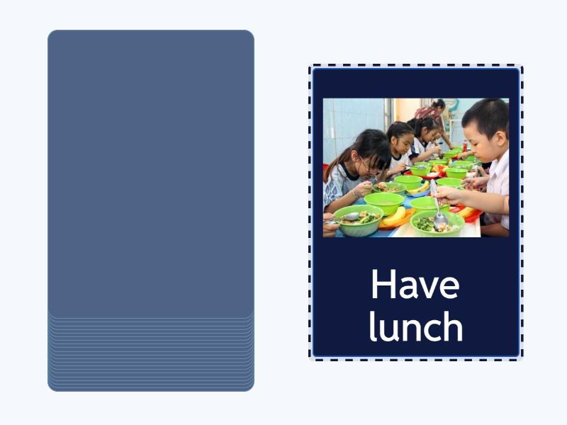 Brush teeth, Wash face, Brush hair, Have breakfast, Have lunch, Do homework, Go to school, Get up, Wake up, Get dressed, Make the bed, Leave the school , Go home, Take a shower, Work, Study, Wash hands, Play computer games, Ride a bike, Go shopping, Listen to music, Play with peers.