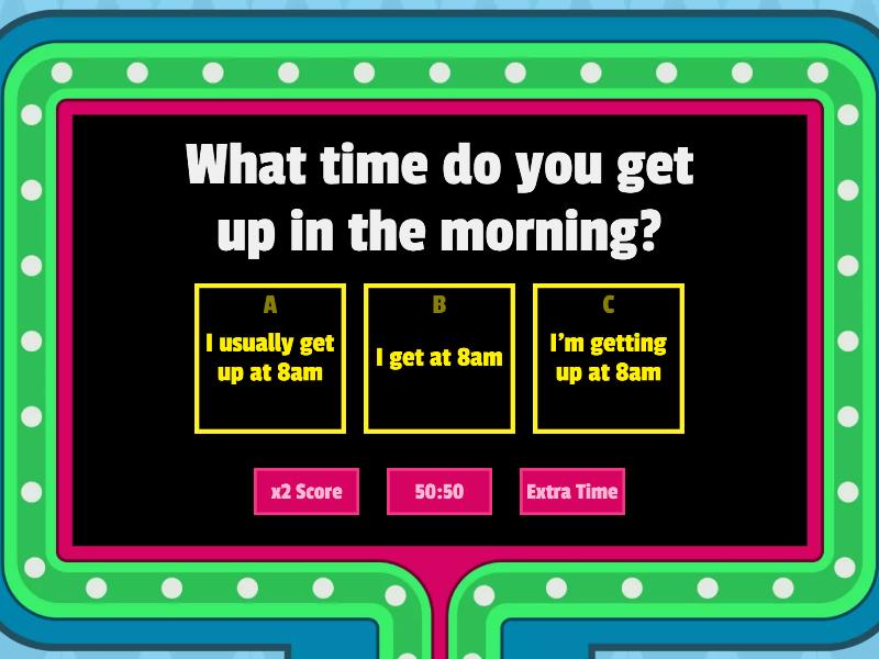 1) What time do you get up in the morning? a) I usually get up at 8am b) I get at 8am c) I'm getting up at 8am 2) Are you studying? a) Yes, I do b) No, am I c) Yes, I am 3) Do you work? Where? a) Yes, I do. I working in Duoc b) Yes, I do. I work at Duoc c) Yes, I does. I work at Duoc 4) Are you traveling right now? a) No, I'm. I'm in Miami b) Yes, I am. I are in Miami c) Yes, I am. I'm in Miami 5) Are you studying English? a) Yes, we are. We're studying all days b) No, we are c) No, we aren't. We're not study 6) What are you wearing today? a) I always wear jeans b) I'm wearing jeand and a jacket c) I don't usually wear sports shoes 7) What do you do? a) I am working on a project b) I work as an engineer c) I am going on vacations