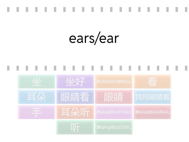 耳朵 - ears/ear, 眼睛 - eyes/eye, 看 - look/watch/see, 听 - listen, 手 - hands/hand, 眼睛看 - look with my eyes, 坐 - sit , 耳朵听 - listen with my ears, 坐好 - sit properly, 我用眼睛看 - I use my eyes to see., 请(qǐng)进(jìn)来(lái)。 - Please come in., 请(qǐng)安(ān)静(jìng)。 - Please be quiet., 请(qǐng)起(qǐ)立(lì)。 - Please stand up., 请(qǐng)坐(zuò)下(xià)。 - Please sit down.,