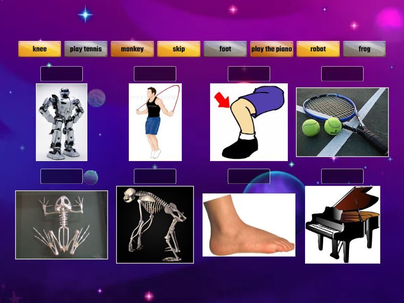 knee, play tennis, head, play the piano, stand on one leg, frog, monkey, crocodile, foot, skip, ride a horse, jump high, fingers, robot, skeleton,