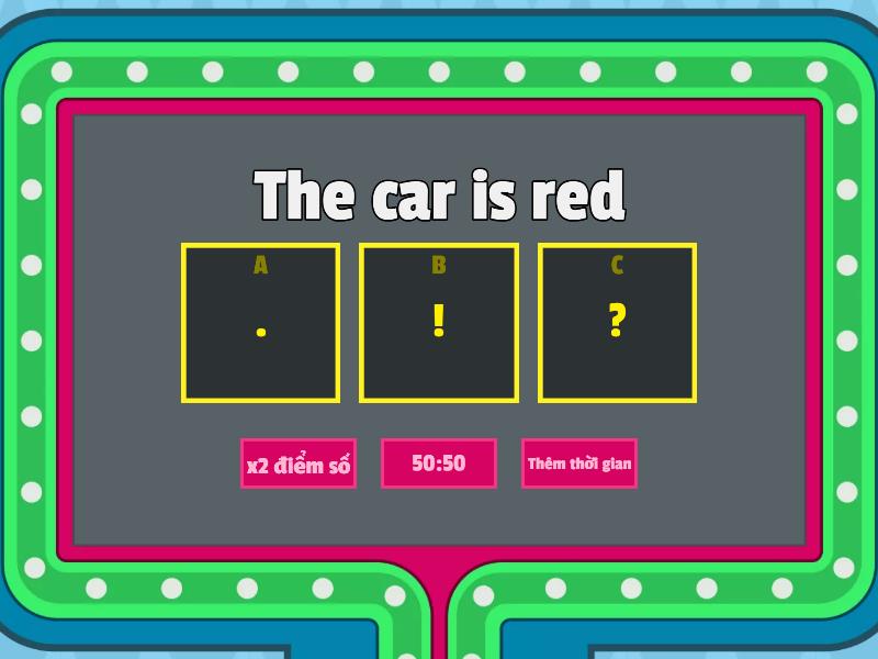 1) The car is red a) . b) ! c) ? 2) Where is the dog a) . b) ! c) ? 3) I love ice cream a) . b) ! c) ? 4) What time is it a) . b) ! c) ? 5) Ben ate the apple a) . b) ! c) ? 6) You are great a) . b) ! c) ? 7) Can I come a) . b) ! c) ? 8) Wow, it is hot today a) . b) ! c) ? 9) I will put my book away a) . b) ! c) ? 10) Did you see that a) . b) ! c) ? 11) I am at the zoo a) . b) ! c) ? 12) Ouch a) . b) ! c) ?