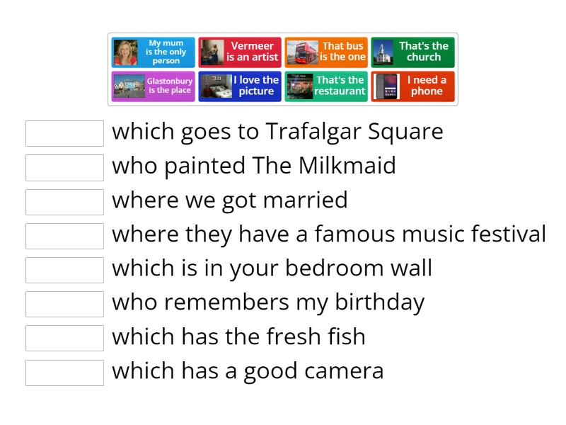 That's the church - where we got married, I need a phone - which has a good camera, My mum is the only person - who remembers my birthday, I love the picture - which is in your bedroom wall, That bus is the one - which goes to Trafalgar Square, Glastonbury is the place - where they have a famous music festival, Vermeer is an artist - who painted The Milkmaid, That's the restaurant - which has the fresh fish,