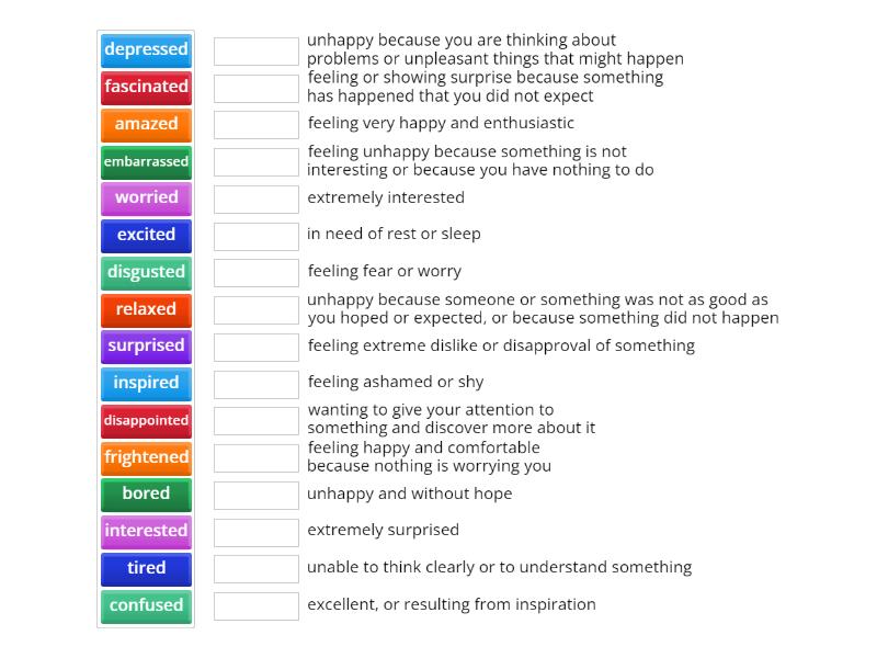 amazed - extremely surprised, bored - feeling unhappy because something is not interesting or because you have nothing to do, confused - unable to think clearly or to understand something, depressed - unhappy and without hope, disappointed - unhappy because someone or something was not as good as you hoped or expected, or because something did not happen, disgusted - feeling extreme dislike or disapproval of something, embarrassed - feeling ashamed or shy, excited - feeling very happy and enthusiastic, fascinated - extremely interested, frightened - feeling fear or worry, inspired - excellent, or resulting from inspiration, interested - wanting to give your attention to something and discover more about it, relaxed - feeling happy and comfortable because nothing is worrying you, surprised - feeling or showing surprise because something has happened that you did not expect, tired - in need of rest or sleep, worried - unhappy because you are thinking about problems or unpleasant things that might happen,