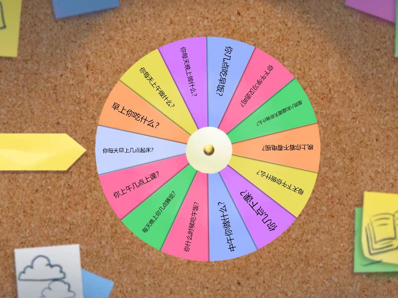 你每天早上几点起床?, 你几点吃早饭?, 你上午几点上课?, 你每天上午做什么?, 你什么时候吃午饭?, 中午你做什么?, 每天下午你做什么?, 你每天晚上做什么?, 早上你吃什么?, 你几点下课?, 你下午学习汉语吗?, 晚上你看不看电视?, 每天晚上你几点睡觉?, 星期六和星期天你做什么?.