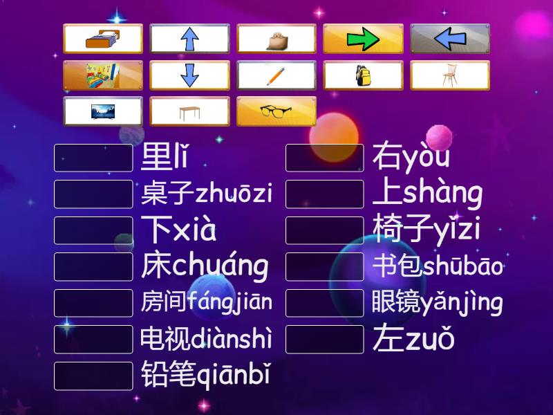 铅笔qiānbǐ, 眼镜yǎnjìng, 书包shūbāo, 上shàng, 下xià, 左zuǒ, 右yòu, 里lǐ, 椅子yǐzi, 桌子zhuōzi, 床chuáng, 房间fángjiān, 电视diànshì,