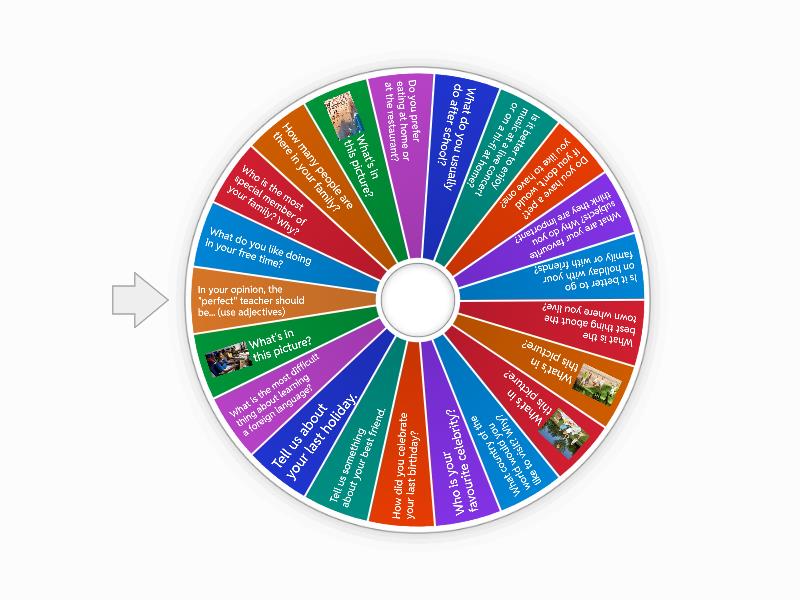 1) What do you like doing in your free time? 2) Who is the most special member of your family? Why? 3) How many people are there in your family? 4) What's in this picture? 5) Do you prefer eating at home or at the restaurant? 6) What do you usually do after school? 7) Is it better to enjoy music at a live concert or on a hi-fi at home? 8) Do you have a pet? If you don't, would you like to have one? 9) What are your favourite subjects? Why do you think they are important? 10) Is it better to go on holiday with your family or with friends? 11) What is the best thing about the town where you live? 12) What's in this picture? 13) What's in this picture? 14) What country of the world would you like to visit? Why? 15) Who is your favourite celebrity? 16) How did you celebrate your last birthday? 17) Tell us something about your best friend. 18) Tell us about your last holiday. 19) What is the most difficult thing about learning a foreign language? 20) What's in this picture? 21) In your opinion, the "perfect" teacher should be... (use adjectives)