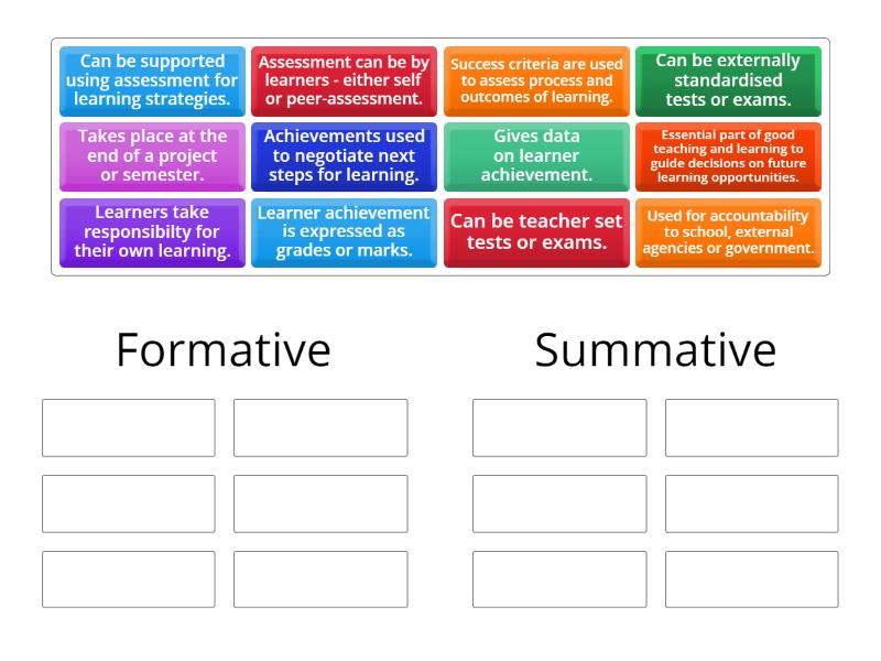 Formative: Essential part of good teaching and learning to guide decisions on future learning opportunities., Success criteria are used to assess process and outcomes of learning., Assessment can be by learners - either self or peer-assessment., Achievements used to negotiate next steps for learning., Learners take responsibilty for their own learning., Can be supported using assessment for learning strategies., Summative: Can be externally standardised tests or exams., Takes place at the end of a project or semester., Gives data on learner achievement., Used for accountability to school, external agencies or government., Learner achievement is expressed as grades or marks., Can be teacher set tests or exams.,