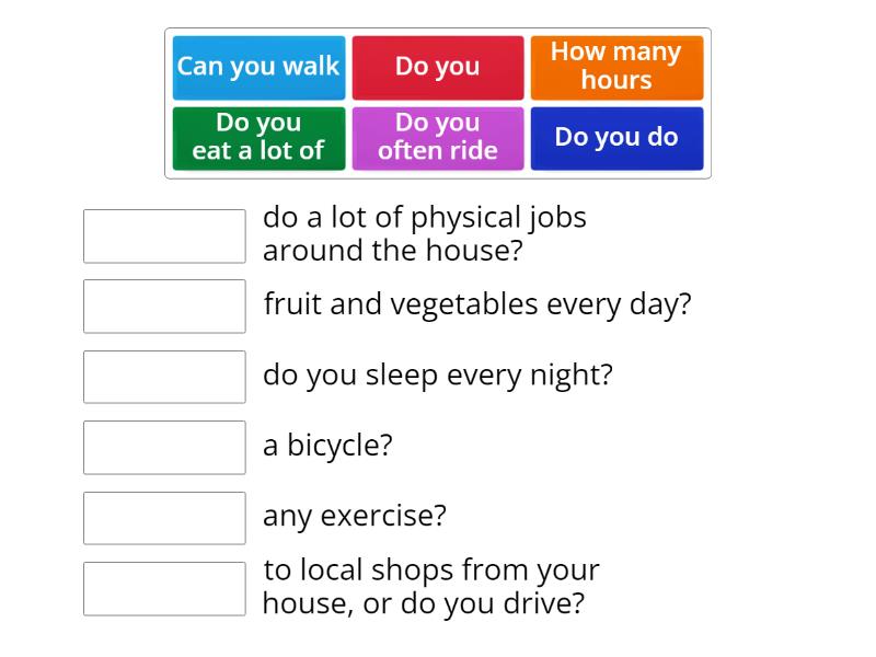 Do you eat a lot of - fruit and vegetables every day?, Do you do - any exercise?, Do you often ride - a bicycle?, Can you walk - to local shops from your house, or do you drive?, How many hours - do you sleep every night?, Do you - do a lot of physical jobs around the house?,