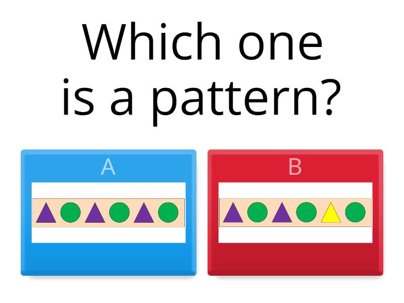 1) Which one is a pattern? a) b) 2) Continue the pattern. a) b) 3) How many repeating shapes does the pattern has? a) 5 b) 2