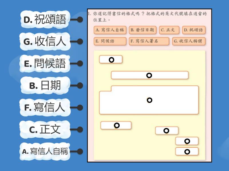 G. 收信人, B. 日期, A. 寫信人自稱, C. 正文, D. 祝頌語, E. 問候語, F. 寫信人.