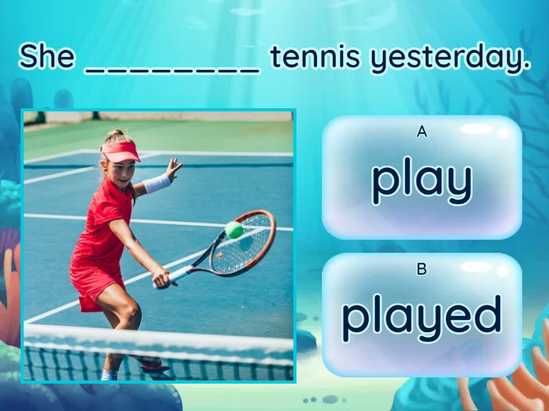 1) She ________ tennis yesterday. a) play b) played 2) They ________TV yesterday. a) watched b) watch 3) She _________ the room last Monday. a) clean b) cleaned 4) They _________ in the rain last Friday. a) jumped b) jump 5) He didn't ___________ football yesterday. a) play b) played 6) They didn't ________ yesterday. a) cooked b) cook 7) We didn't __________ in the sea last summer. a) played b) play 8) They ____________ the museum last Sunday. a) didn't visit b) didn't visited 9) The teacher _______ me yesterday. a) didn't asked b) didn't ask 10) She _________ yesterday. a) didn't skated b) didn't skate 11) I _________ my mistake. a) didn't notice b) didn't noticed 12) Did they play computer games? a) Yes, they did. b) No, they didn't. 13) Did they visit the museum? a) Yes, they did. b) No, they didn't. 14) Did she watch TV? a) Yes, she did. b) No, she didn't. 15) Did the boy visit the zoo? a) Yes, he did. b) No, he didn't. 16) Did he wash the car yesterday? a) Yes, he did. b) No, he didn't. 17) Did she play the piano? a) Yes, she does. b) Yes, she did. 18) Did he dive last summer? a) Yes, he does. b) Yes, he did. 19) Did they play computer games? a) No, they didn't. b) No, they don't. 20) Did they wash the car? a) Yes, they did. b) Yes, they do.