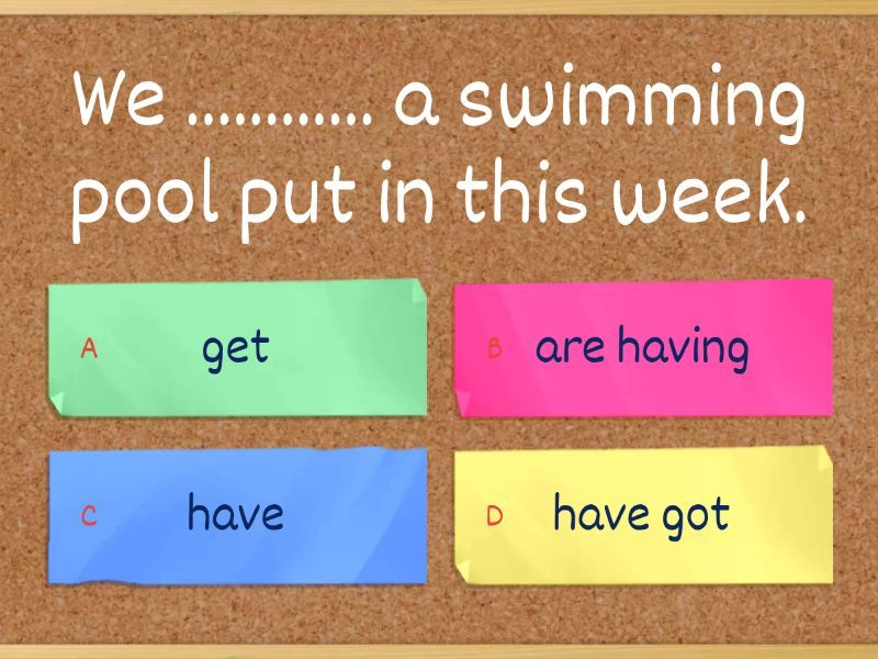 1) We ............ a swimming pool put in this week. a) get b) are having c) have d) have got 2) Why don't you get a doctor ............ at your arm? a) to look b) looked c) look d) be looking 3) My teeth were a little yellow so I ............ by the dentist. a) had cleaned them b) have them cleaned c) was cleaned them d) had them cleaned 4) Stuart's thinking of having ............ ! a) shaved his head b) his head shaving c) his head shaved d) shaved to his head 5) My sister ............ her ear pierced last weekend. a) made b) got c) did d) took 6) Mum and Dad didn't fancy cooking, so we got a pizza ............. a) be delivered b) to be delivered c) delivered d) deliver 7) You should ............ a professional to check your house for earthquake damage. a) have b) make c) take d) get 8) Kelly wanted to have a live band ............ at her wedding. a) to be played b) play c) played d) been playing 9) Can we ............ this summer? a) get installed air-conditioning b) get air-conditioning to install c) have installed air-conditioning d) have air-conditioning installed 10) We ............ while we were on holiday. a) were burgled our house b) had our house burgled c) had burgled our house d) got burgled our house