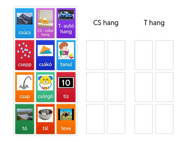 CS hang: CS - csibe hang, csap, csúcs, csörgő, csákó, csepp, T hang: T- autó hang, teve, tó, tíz, tál, tanul,