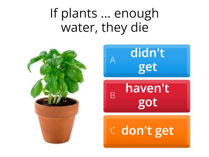 1) If plants ... enough water, they die a) didn't get b) haven't got c) don't get 2) The teacher ... pleased if you do your homework. a) would be b) will be c) was 3) Kirk will fail the exam unless he... a) will study b) doesn't study c) studies 4) If Ben ... this competition, he'll be sad. a) doesn't win b) won't win c) win 5) If you tell me your secret, I ... anyone. a) won't tell b) don't tell c) didn't tell 6) You won't get better soon ... to the doctor. a) if you go b) unless you go c) unless you went 7) You can't win Survivor ... all the challenges. a) if you didn't do b) unless you don't do c) unless you do