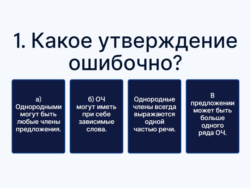1) 1. Какое утверждение ошибочно? a) а) Однородными могут быть любые члены предложения. b) б) ОЧ могут иметь при себе зависимые слова. c) Однородные члены всегда выражаются одной частью речи. d) В предложении может быть больше одного ряда ОЧ. 2) Какой союз является разделительным? a) ни… ни b) зато c) как… так и d) то… то. 3) В каком предложении знаки препинания расставлены неправильно? a) За дверью послышался не то смех, не то плач. b) Последнее время приходилось работать и день и ночь. c) Овощи не только вкусны, но и полезны. d) Говорил он бойко, однако, бестолково. 4) В каком предложении нужно поставить одну запятую? a) Медведи – животные большие сильные да и ловкие. b) Цветы могут быть как однолетними так и многолетними. c) Пушкин собирал народные песни и сказки в Одессе и в Кишинёве и в Псковской губернии. d) Стоял тихий сентябрьский денёк. 5) Установите, какие ряды однородных членов есть в данном предложении. Старинная русская деревня Болдино лежит среди просторных то пологих то холмистых полей и лугов и красуется. a) три ряда: определения, сказуемые, дополнения; b) два ряда: сказуемые и дополнения; c) три ряда: сказуемые, обстоятельства, определения.
