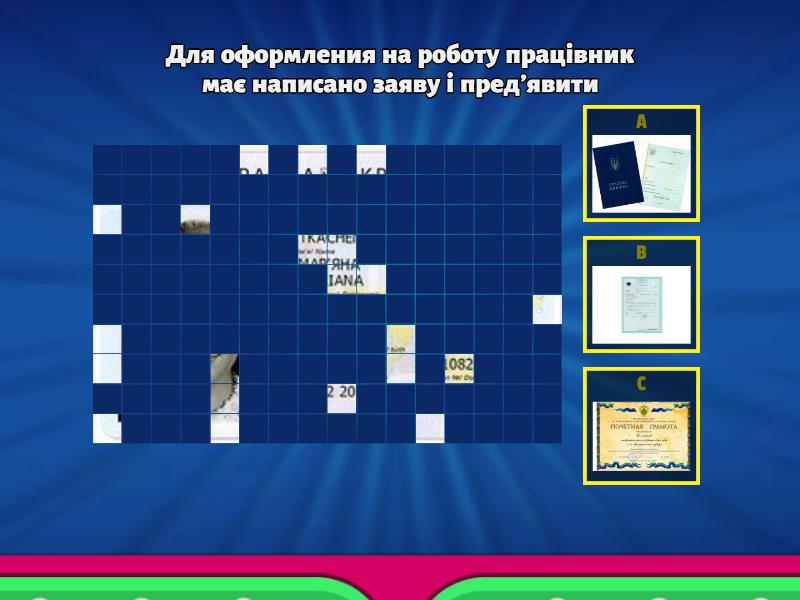 1) Для оформления на роботу працівник має написано заяву і пред'явити a) b) c) 2) Який ще документ потрібний для влаштування на роботу a) b) c) d) 3) Особи, з якого віку не допускаються на роботу, пов'язану із безпекою руху поїздів, . a) b) c) d) 4) Для робіт на підприємствах з шкідливими умовами праці під час прийняття на роботу мають пройти a) b) c) d) 5) Також при прийнятті на роботу потрібно буде писати a) b) c) d) 6) Після прийняття на роботу для особи виписується a) b) c) d) 7) Під час оформлення на роботу службовців їх ознайомлюють з a) b) c) d) 8) Працівник має право за своєю иніціативою припинити трудовых договоров, передивши власника письмово за .... тижніи a) b) c) d) 9) Неприпустимим є звільнення працівника в період його закінчення відпустки або a) b) c) d) 10) У день звільнення з роботи обов'язково провести розрахунок з працівником і a) b) c) d) 11) документ, у якому висвітлюються професійні претенденти на конкретну посаду a) b) c) d) 12) документ, у якому висвітлюються певнв етапи життя людини a) b) c) d)