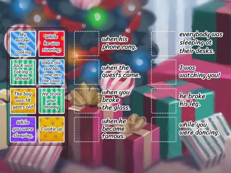 While he was running, - he broke his leg., Jack was taking a shower - when his phone rang., My mother was cooking - when the quests came., While you were sleeping, - I was watching you!, I woke up - when you broke the glass., He stole your money - while you were dancing., The boy was 18 years old - when he became famous., When the teacher came into the class, - everybody was sleeping at their desks.,