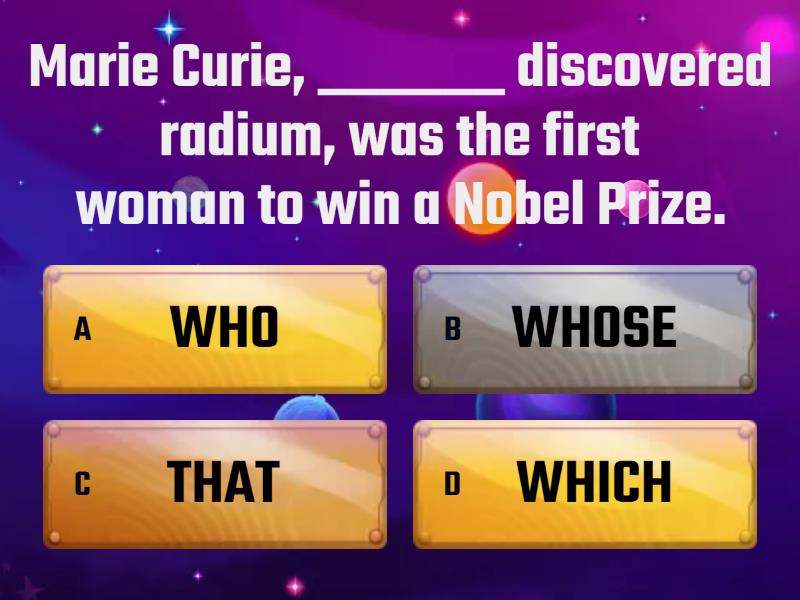 1) Marie Curie, ______ discovered radium, was the first woman to win a Nobel Prize. a) WHO b) WHOSE c) THAT d) WHICH 2) Rosalind Franklin was a scientist ______ work contributed to the discovery of DNA’s structure. a) WHICH b) THAT c) WHOSE d) WHO 3) Katherine Johnson, _______ calculations helped NASA, worked as a mathematician. a) WHICH b) WHOSE c) WHO d) THAT 4) Jane Goodall is a scientist ______ studies on chimpanzees changed our understanding of primates. a) WHO b) THAT c) WHICH d) WHOSE 5) The experiment ______ they conducted led to an important breakthrough. a) WHOSE b) WHEN c) WHO d) WHICH/THAT 6) The professor _______ lectures we attended is an expert in genetics. a) WHOSE b) WHO 7) The telescope ___________ was invented centuries ago has helped scientists explore space. a) WHOSE b) WHICH/THAT