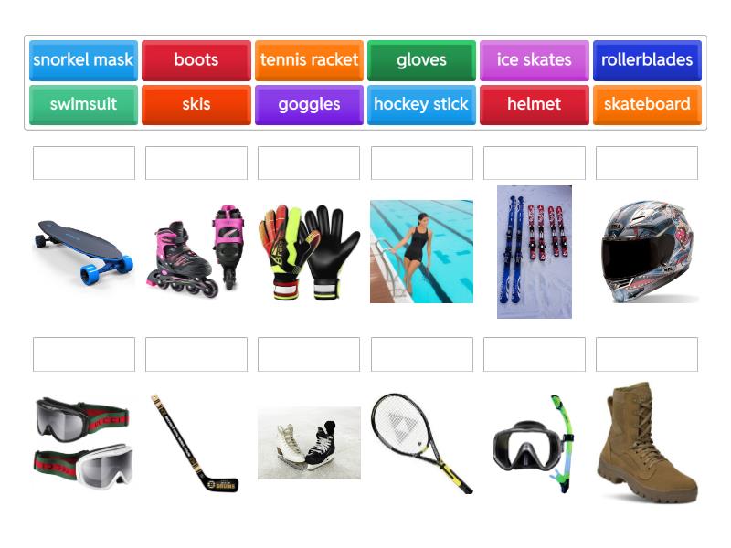 boots, gloves, goggles, helmet, hockey stick, ice skates, rollerblades, skateboard, skis, snorkel mask, swimsuit, tennis racket,