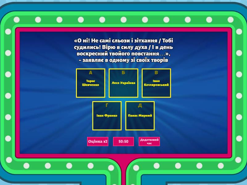 1) Вірш «Чого являєшся мені у сні?..» І. Франка написаний у формі a) коломийки b) молитви   c) діалогу   d) полілогу e) монологу-сповіді 2) У творі «Мойсей» головний герой розповів своєму народу казку, у якій дерева обрали собі королем a) дуба b) кедра c) терен d) пальму e) березу 3) Азазель у поемі «Мойсей» — це a) А пророк b) темний демон пустелі c) князь конюхів d) світла сила e) кочівник 4) Події в поемі «Мойсей» розгортаються в такій послідовності: a) заклик Єгошуа до бою — притча про дерева, що обирали собі короля — вигнання Мойсея з табору — спокуса Азазеля b) вигнання Мойсея з табору — притча про дерева, що обирали собі короля — спокуса Азазеля — заклик Єгошуа до бою c) притча про дерева, що обирали собі короля — спокуса Азазеля — вигнання Мойсея з табору — заклик Єгошуа до бою d) спокуса Азазеля — притча про дерева, що обирали собі короля — вигнання Мойсея з табору — заклик Єгошуа до бою e) притча про дерева, що обирали собі короля — вигнання Мойсея з табору — спокуса Азазеля — заклик Єгошуа до бою 5) До композиційних особливостей поеми «Мойсей» належать a) чотири частини, епілог b) пролог, двадцять пісень c) розлогі пейзажі, інтер’єри d) зміщення часових площин, рефрен e) притча в поемі, обрамлення 6) Головна ідея поеми «Мойсей» — це a) засудження пророка за недотримання даного народові слова b) оспівування славного минулого єврейського народу c) заклик вірити у свій народ, позбутися рабської психології й будувати нове життя d) викриття ганебної політики Єгипту щодо єврейського народу e) засудження молодого покоління через його недалекоглядність 7) Як називалась збірка І. Франка до якої входила поезія «Гімн»? a) «Мій ізмарагд» b) «Semper tiro» c) «Зів'яле листя» d) «З вершин і низин» 8) IX поезія у ”Зів'ялому листі”: ”Розвійтеся з вітром, листочки зів'ялі, незгоєні рани, невтішні жалі...” , яка була присвячена Ользі Рошкевич відноситься до a) інтимної лірики b) філософської лірики c) громадянської лірики d) релігійної лірики 9) Кому у поемі «Мойсей» співчуває І. Франко. a) Лесі Українці через її невиліковну хворобу b) єврейському народу, який сорок років блукав пустелею c) усьому людству, адже життя таке важке d) лідерові, який намагається зробити щось важливе і вагоме для народу, а його критикують і не розуміють 10) Зі скількох пісень складається поема «Мойсей»? a) з двадцяти b) з вісімнадцяти c) з десяти d) з тринадцяти 11) Рядки «Так, ти богиня! Мати, райська роже,/ О глянь на мене з свої висоти!/ Бач, я, що в небесах не міг найти/ Богів, перед тобою клонюсь тоже» належать a) Іванові Франку b) Василю Симоненку c) Дмитру Павличку d) Тарасу Шевченку e) Панасу Мирному 12) Прагнення народу до національної самостійності, до волі відображено у творі a) «Мойсей» Івана Франка b) «Слово про похід Ігорів» невідомого автора c) «Лісова пісня» Лесі Українки d) «Сон» («У всякого своя доля») Тараса Шевченка e) «Мартин Боруля» І. Карпенка-Карого 13) Правильну послідовність створення поетичних збірок відображено в рядку a) “Кобзар”, “Сад Божественних пісень”, “Зів’яле листя”, “Сонячні кларнети” b) “Сад Божественних пісень”, “Кобзар”, “Сонячні кларнети”, “Зів’яле листя” c) “Сад Божественних пісень”, “Зів’яле листя”, “Кобзар”, “Сонячні кларнети” d) “Сонячні кларнети”, “Сад Божественних пісень”, “Кобзар”, “Зів’яле листя” e) “Сад Божественних пісень”, “Кобзар”, “Зів’яле листя”, “Сонячні кларнет