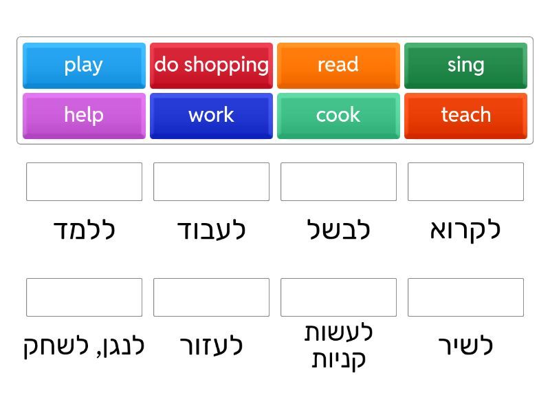 work - לעבוד, read - לקרוא, teach - ללמד, cook - לבשל, help - לעזור, sing - לשיר, play - לנגן, לשחק, do shopping - לעשות קניות,