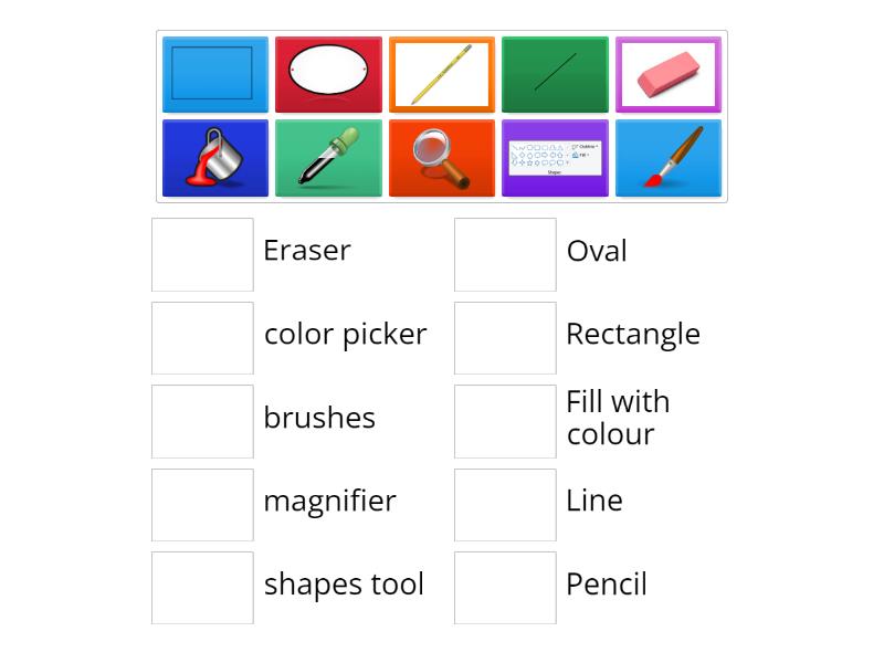 Pencil, Eraser, Line, Oval, Rectangle, Fill with colour, color picker, magnifier, brushes, shapes tool,