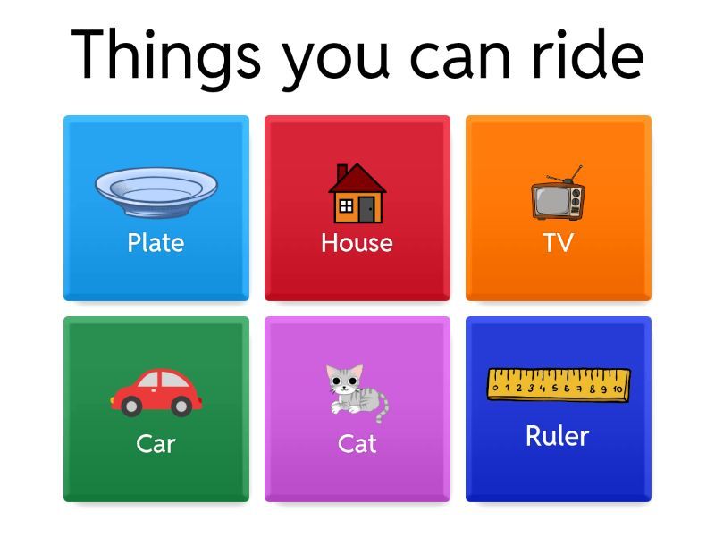 1) Tell me animals a) Giraffe b) Apple c) Table d) Brocolli e) Soap f) Pencil 2) Tell me school items a) Giraffe b) Apple c) Table d) Brocolli e) Soap f) Pencil 3) Things you can watch a) Plate b) House c) TV d) Car e) Cat f) Ruler 4) Which one is fruit a) Dog b) Banana c) Shirt d) Laptop e) Nose f) Pillow 5) Something you can read a) Elephant b) Police Car c) Rabbit d) Sofa e) Book f) Pizza 6) Find the clothing a) Chicken b) Orange c) Milk d) Pants e) Chair f) Bicycle 7) Something you can eat a) Elephant b) Police Car c) Rabbit d) Sofa e) Book f) Pizza 8) Things you can ride a) Plate b) House c) TV d) Car e) Cat f) Ruler