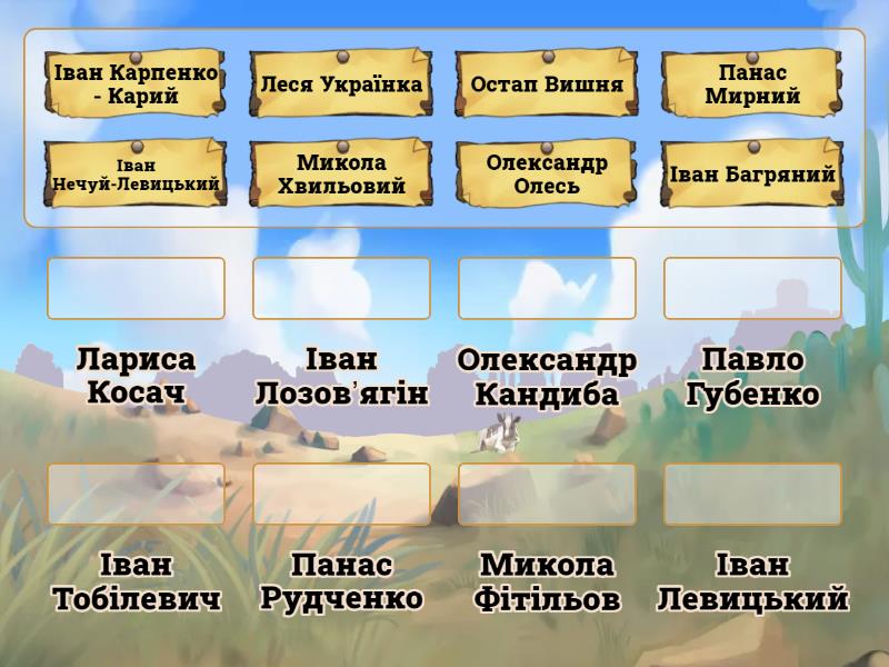 Панас Мирний - Панас Рудченко, Леся Українка - Лариса Косач, Іван Нечуй-Левицький - Іван Левицький, Іван Карпенко - Карий - Іван Тобілевич, Микола Хвильовий - Микола Фітільов, Остап Вишня - Павло Губенко, Іван Багряний - Іван Лозов’ягін, Олександр Олесь - Олександр Кандиба,