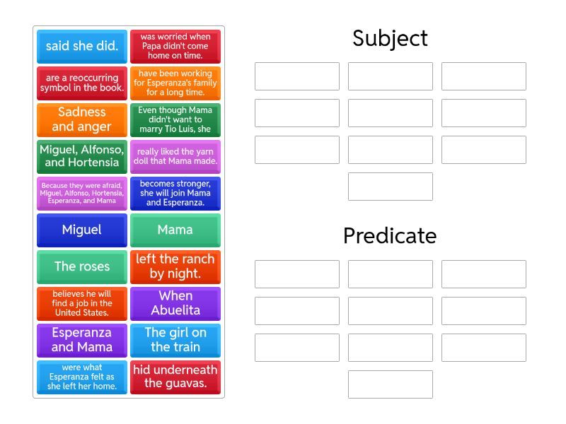 Subject: Esperanza and Mama, The roses, When Abuelita, Even though Mama didn't want to marry Tio Luis, she, Miguel, Alfonso, and Hortensia, Because they were afraid, Miguel, Alfonso, Hortensia, Esperanza, and Mama, Sadness and anger, Mama, The girl on the train, Miguel, Predicate: hid underneath the guavas., are a reoccurring symbol in the book., becomes stronger, she will join Mama and Esperanza., said she did., have been working for Esperanza's family for a long time., left the ranch by night., were what Esperanza felt as she left her home., was worried when Papa didn't come home on time., really liked the yarn doll that Mama made., believes he will find a job in the United States.,