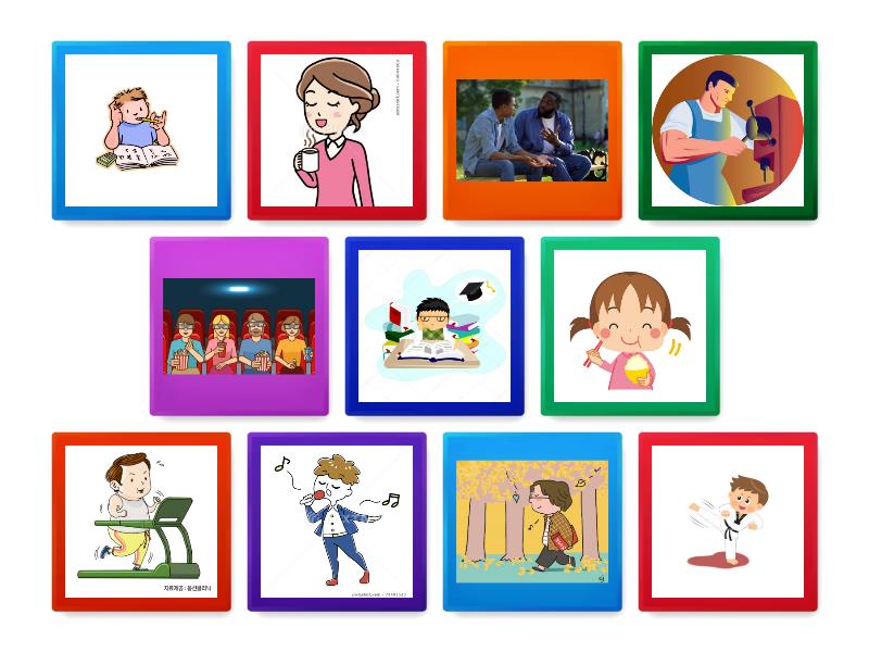 일하다, 공부하다, 숙체하다, 이야기하다, 노래하다, 운동하다, 산책하다, 영화를 보다, 태권도를 배우다, 밥을 먹다, 커피를 마시다,