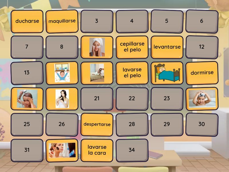 despertarse, levantarse, ducharse, lavarse el pelo, lavarse la cara, dormirse, maquillarse, cepillarse el pelo, mirarse, bañarse, lavarse las manos, ponerse, arreglarse el pelo, afeitarse, pintarse las uñas, secarse, cepillarse los dientes,