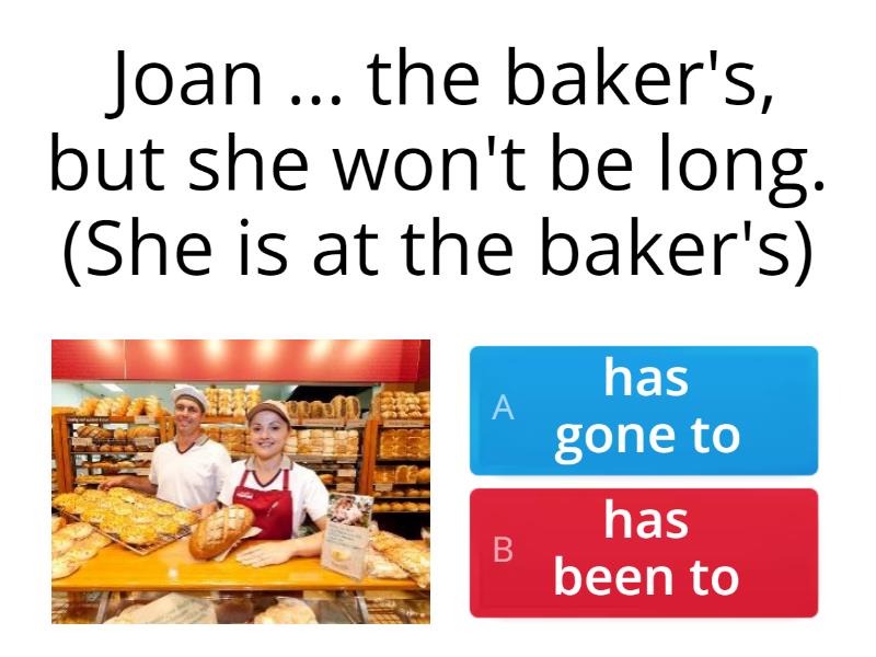 1) Joan ... the baker's, but she won't be long. (She is at the baker's) a) has gone to b) has been to 2) Rick ... India. He really liked it. (He was there 2 years ago. He's not there now.) a) has gone to b) has been to c) been to d) gone to 3) Have you ever ... New York? a) been b) gone c) been to d) gone to 4) He has ... out. He'll be back soon. a) gone b) been c) has gone d) has been 5) Have you ever ... to the UK? a) gone b) been c) has been d) has gone 6) Where is Mum? Has she ... the supermarket? a) gone to b) been to c) gone d) been 7) We have no bread. Gary has ... to the baker's to buy some . a) gone to b) been to c) gone d) been 8) Helena has never ... Japan before so she's very excited about the trip. a) gone to b) been to c) been d) gone 9) George has ... the post office, but he won't be long. You can wait for him, if you like. a) gone b) been to c) been d) gone to 10) Tina has ... the bank; would you like to wait until she comes back? a) gone to b) been to c) been d) gone 11) We haven't ... the flea market for ages. Do you want to go next week? a) gone to b) been c) been to d) gone 12) Ivan is ill. He hasn't ... school. He's still upstairs in his room. a) gone to b) been to c) been d) gone 13) Have you ever ... Las Vegas? a) gone to b) been to c) been d) gone
