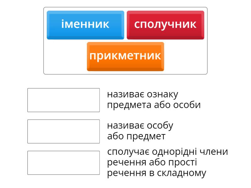 іменник - називає особу або предмет, прикметник - називає ознаку предмета або особи, сполучник - сполучає однорідні члени речення або прості речення в складному,