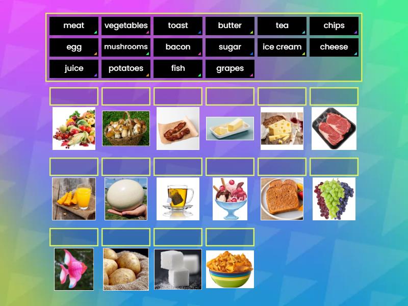 egg, chips, mushrooms, toast, grapes, bacon, sugar , butter, meat, potatoes, tea, ice cream, vegetables, fish, juice, cheese,