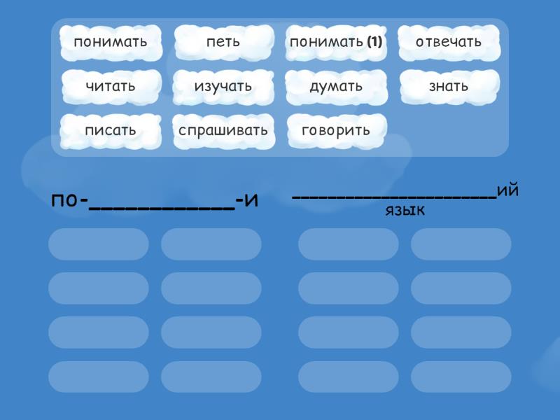 по-____________-и: говорить, писать, читать, думать, петь, отвечать, спрашивать, понимать (1), _______________________ий язык: знать, изучать, понимать,