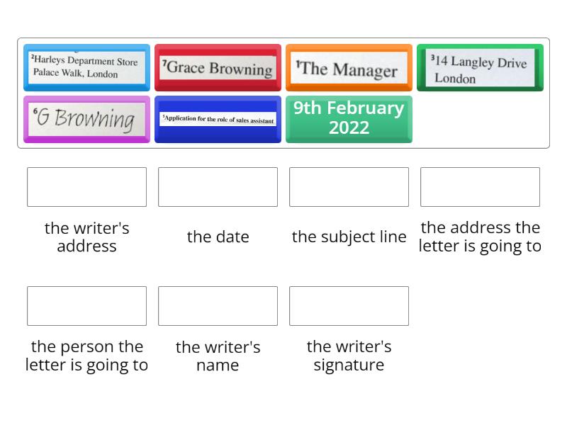 the person the letter is going to, the address the letter is going to, the writer's address, 9th February 2022 - the date, the subject line, the writer's signature, the writer's name,
