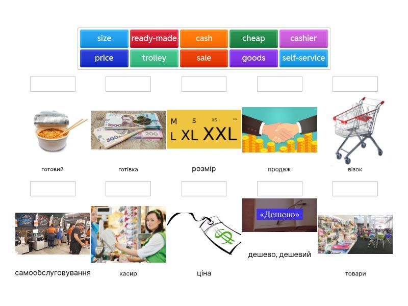 cash - готівка, cashier - касир, cheap - дешево, дешевий, goods - товари, price - ціна, sale - продаж, self-service - самообслуговування, size - розмір, trolley - візок, ready-made - готовий,