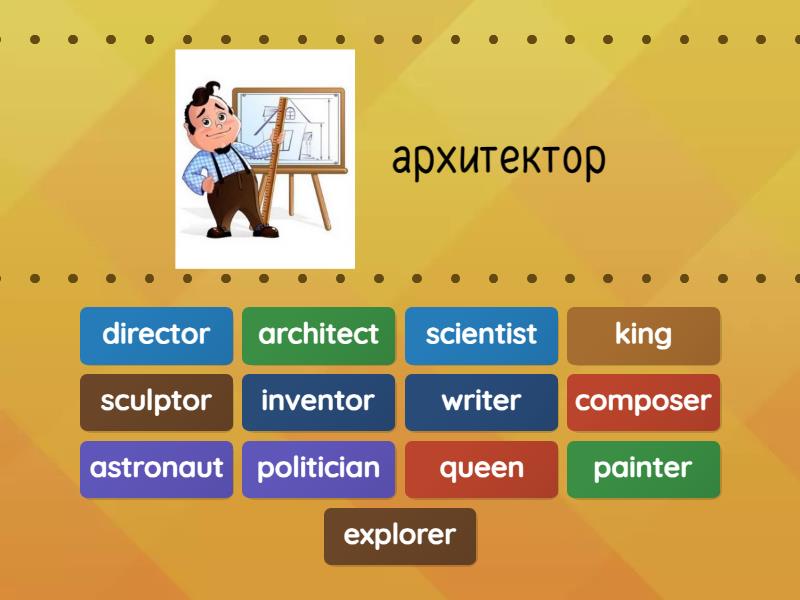 architect - архитектор, astronaut - астронавт, composer - композитор, director - начальник, explorer - исследователь, inventor - изобретатель, king - король, painter - художник, politician - политик, queen - королева, scientist - ученый, sculptor - скульптор, writer - писатель,