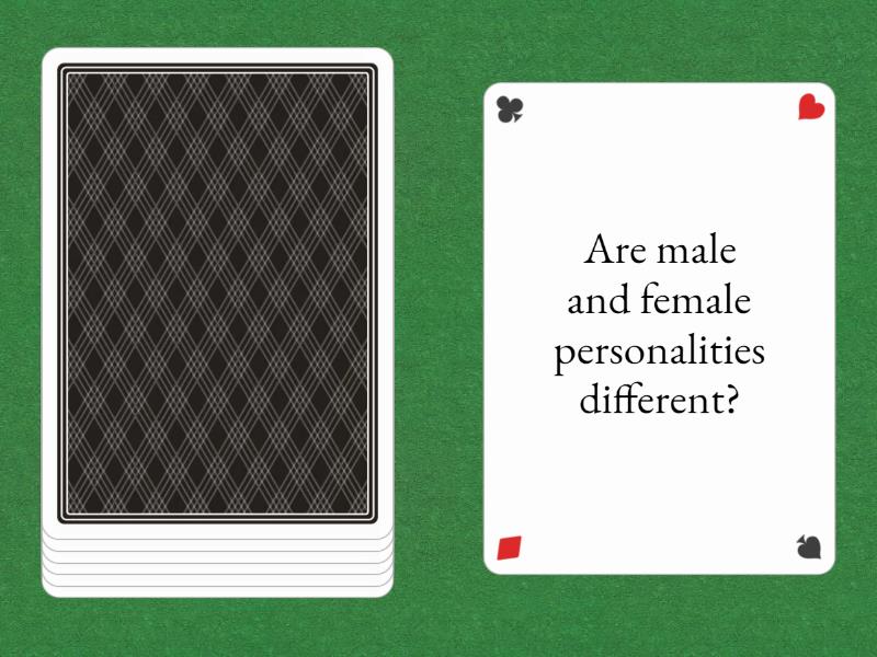 What kind of people do you get along well with?, What personality types are you attracted to?, Do you think we are born with our personalities, or do we develop them because of what happens to us?, Are male and female personalities different?, Is your personality more similar to your mother's or father's?, What personality traits are important in a good friend/ a boss/ a wife?, In what way has your personality changed? Why has it changed?.