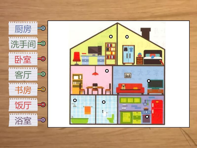 客厅, 饭厅, 书房, 厨房, 浴室, 洗手间, 卧室.