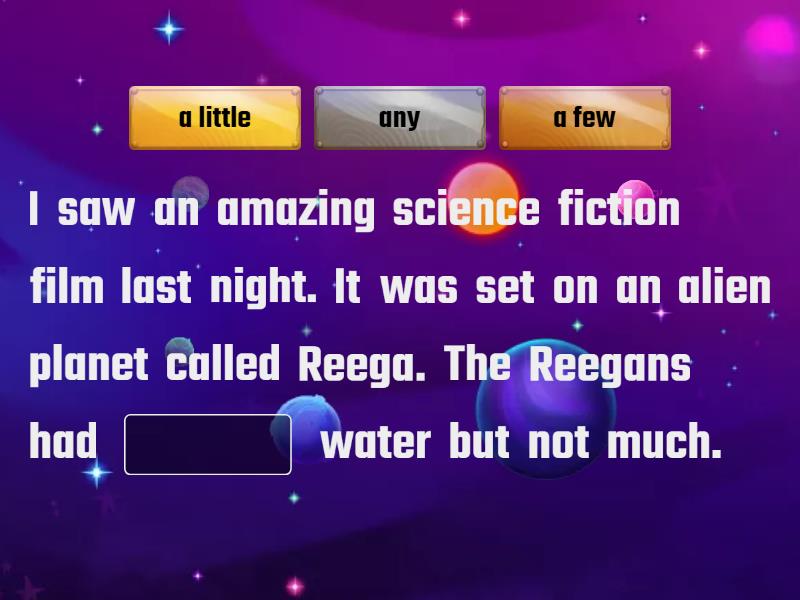 I saw an amazing science fiction film last night. It was set on an alien planet called Reega. The Reegans had ____ water but not much. There were only ____ animals still alive. There was ____ poverty and hunger. Then ____ humans landed on the planet. They brought ____ food and water with them and at first, everyone was very happy. But the humans didn't have ____ respect for the Reegans traditions. They destroyed ____ important Reegan buildings. Finally, ____ humans left Reega and returned to Earth. But ____ humans stayed and they formed a new, stronger society together with the Reegans.
