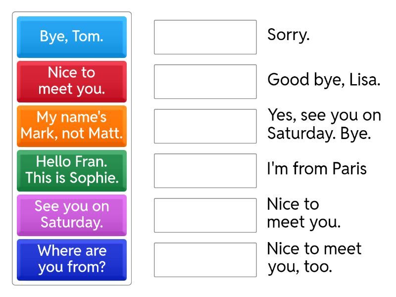 Hi!, I'm Charlie. What's your name? - My name's Freddie., Nice to meet you. - Nice to meet you, too., What's your phone number? - It's 7894132456, See you on Saturday. - Yes, see you on Saturday. Bye., Hello, George. - Hello, Sarah., How are you? - I'm very well. Thank you., Hello Fran. This is Sophie. - Nice to meet you., My name's Mark, not Matt. - Sorry., Bye, Tom. - Good bye, Lisa. , Where are you from? - I'm from Paris, What do you do? - I'm a doctor,
