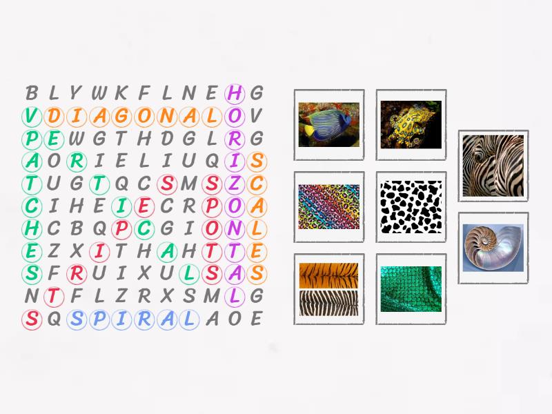 stripes, vertical, diagonal, horizontal, spiral, spots, patches, scales,