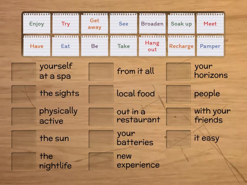 See - the sights, Take - it easy, Eat - out in a restaurant, Get away - from it all, Broaden - your horizons, Have - new experience, Soak up - the sun, Try - local food, Be - physically active, Pamper - yourself at a spa, Hang out - with your friends, Enjoy - the nightlife, Meet - people, Recharge - your batteries,