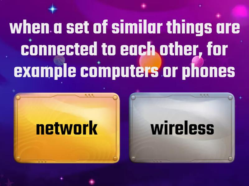 1) when a set of similar things are connected to each other, for example computers or phones a) network b) wireless 2) a screen on a computer, tablet or phone that you touch in order to choose what you a) network b) touch screen 3) a type of connection to the Internet that allows you to receive or send a lot of information very quickly a) network b) broadband 4) this technology communicates using alectronic signals, not with wires a) wireless b) charger 5) the strength of the signal to your phone from your network a) broadband b) coverage 6) a list of options that appears on a screen when you press it a) drop-down menu b) touchscreen 7) a small and sudden problem especially with technology a) glitch b) charger 8) an object used to connect a piece of equipment to an electricity supply a) plug b) wireless 9) a machine or piece of equipment that does particular thing a) device b) charger